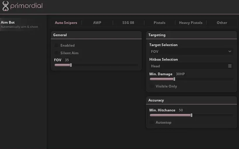 В составе чита Primordial присутствуют автоматический аимбот, анти-антишит функции, мощный ВХ и другие полезные возможности для удобной и быстрой игры. Чит работает стабильно и не вызывает лагов, обеспечивая плавный игровой процесс. Современная технология обхода защиты позволяет использовать чит даже на последних обновлениях CS 2 без риска блокировки. Primordial поможет вам получить уверенность и контроль над игрой, делая каждый матч выигрышным.