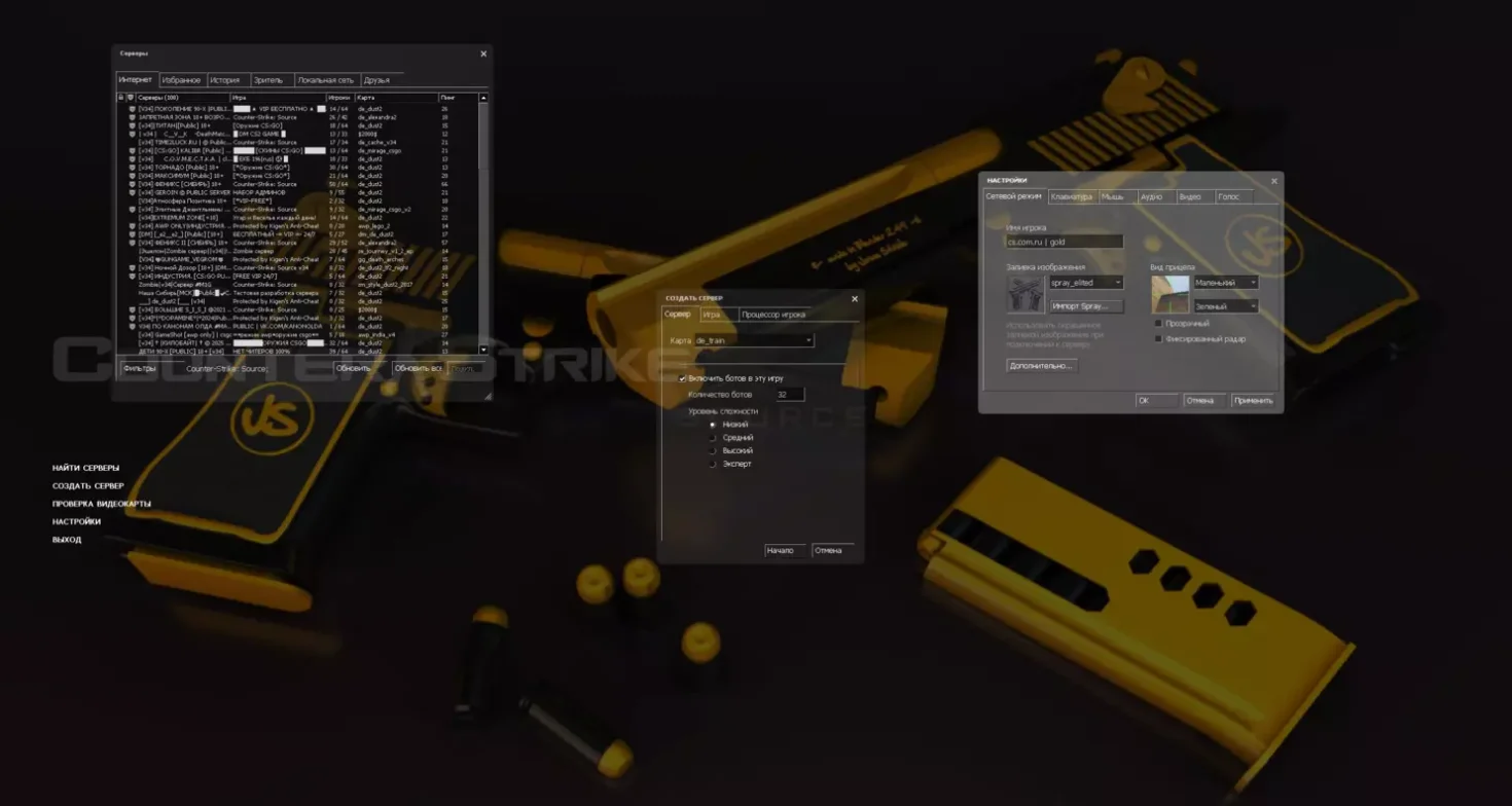 CS:S Gold Weapons — это не просто визуальный мод, а полноценная сборка клиента с полной поддержкой игры по сети, через интернет и с ботами. Модели оружия проработаны до мельчайших деталей, а при выстрелах и перезарядке создаётся эффект настоящего элитного оружия. Интерфейс клиента также обновлён под общую золотую стилистику: меню, прицел, элементы HUD выполнены в едином тоне. При этом клиент остаётся удобным, понятным и полностью русифицированным. Встроенный мастер-сервер позволяет легко находить активные сервера для онлайн-игры, а наличие режима с ботами — отличный вариант для тренировки без интернета.
